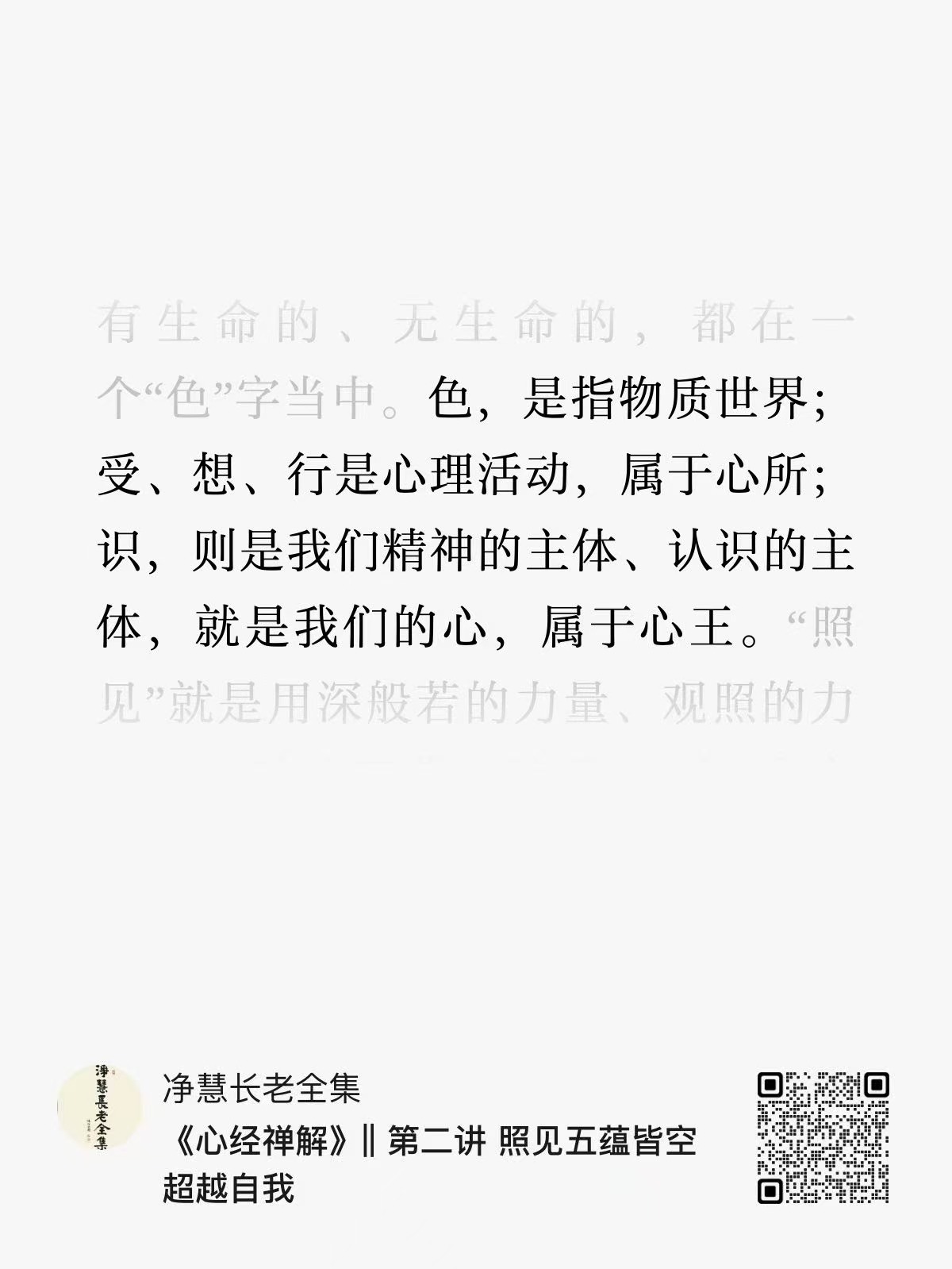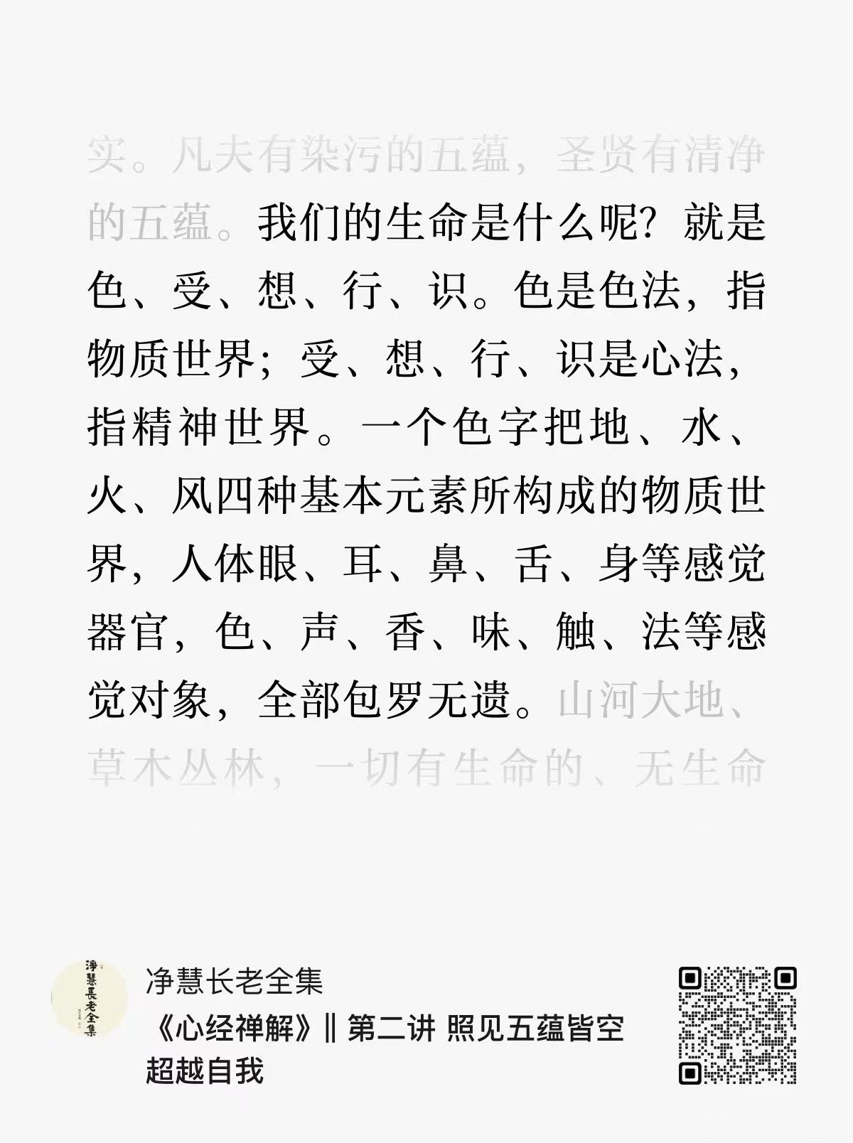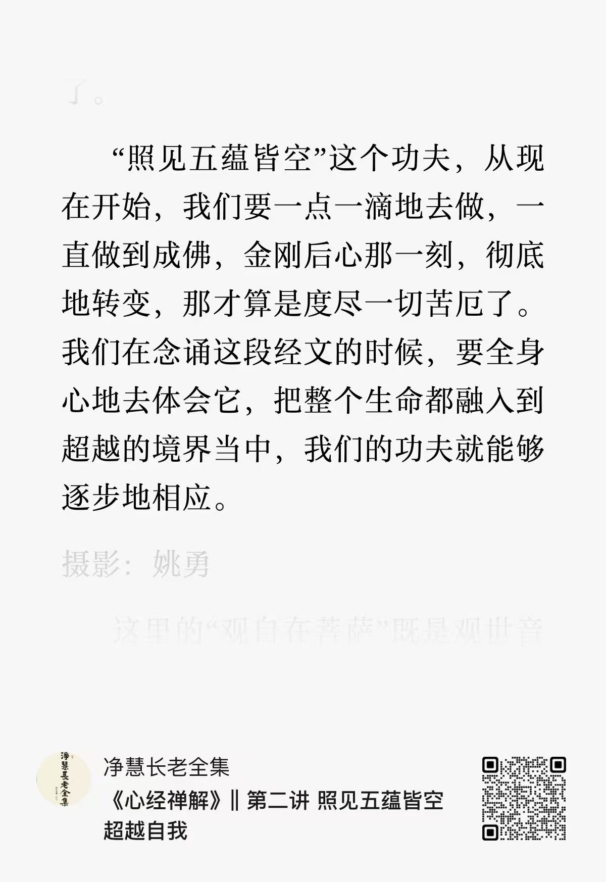 [【附件】什么是当下呢?——老和尚如是说(1).mp3](/media/attachment/2025/07/%E4%BB%80%E4%B9%88%E6%98%AF%E5%BD%93%E4%B8%8B%E5%91%A2%E8%80%81%E5%92%8C%E5%B0%9A%E5%A6%82%E6%98%AF%E8%AF%B41.mp3) [净慧长老开示:在当下一念上下功夫(视频)](https://mp.weixin.qq.com/s?__biz=MjM5MDM0MDY0NQ==&mid=2651274949&idx=1&sn=31502df82fe93135ebe197efbdefe2eb&chksm=bcc564a4e0235d6bd4411e11f5293624339ac59cd0fde6832c851a18ff39508c1f0399a013b5&mpshare=1&scene=1&srcid=0719lKXrn1x411puBFFm0UwT&sharer_shareinfo=efb41be4592c32f8b8ff2fcd06ca629c&sharer_shareinfo_first=efb41be4592c32f8b8ff2fcd06ca629c&exportkey=n_ChQIAhIQ2M9QRdirBfJtFfDhZXc5dBKeAgIE97dBBAEAAAAAAAIuBKFI9aMAAAAOpnltbLcz9gKNyK89dVj0%2BHbigWUUdKDHUdamP6gLahoY%2FXABvdsh%2BRMFNsQXuZ16A2k9SquMf3CKDAU5%2FNmZKojL8a41Ex2H0%2ByONA80a5aeyTvWGMuoKHH5WOs3cZvx%2FlbYL%2BsjMcESfcaIoIqLjsojCiUkCZ7UALvcGmb8Hvd5nNIkqqiXz4guL0Llt71iyY79KPa0DI6Yy1QLImLuFD0abD3PCJ%2FYqciQ6xKIbGGxj5OJbDjnUkkeIshLZxw%2Bm2QaBbsYUEvmUWBzqEoyhf98%2Br%2BFUqRmmpPXnIfz8ODv%2B0kBhAoCBvbAp%2Fqn2Ry2n5Oh5iA6wkchCzAJ%2BT%2BwHWvlk6wBiFc%3D&acctmode=0&pass_ticket=5VyNy5tjNBcYMu6sAlT%2BvYI6PAVOPqVSsi8AY6wh2hc4h86%2B3uJlBET%2B6EAU8X%2BK&wx_header=0#rd "净慧长老开示:在当下一念上下功夫(视频)") [《每日精进》科比:睡眠与冥想](https://m.baidu.com/video/page?pd=video_page&nid=7545303777375248577&sign=&word=%E3%80%8A%E6%AF%8F%E6%97%A5%E7%B2%BE%E8%BF%9B%E3%80%8B%E7%A7%91%E6%AF%94%EF%BC%9A%E7%9D%A1%E7%9C%A0%E4%B8%8E%E5%86%A5%E6%83%B3&oword=%E3%80%8A%E6%AF%8F%E6%97%A5%E7%B2%BE%E8%BF%9B%E3%80%8B%E7%A7%91%E6%AF%94%EF%BC%9A%E7%9D%A1%E7%9C%A0%E4%B8%8E%E5%86%A5%E6%83%B3&atn=index&ext=%7B%22jsy%22%3A1%7D&top=%7B%22sfhs%22%3A1%2C%22_hold%22%3A2%7D&_t=1753766971898 "《每日精进》科比:睡眠与冥想") [净慧禅语 || “执著”就是······](https://mp.weixin.qq.com/s?__biz=MzU2MzY2MjQ3OA==&mid=2247507758&idx=2&sn=7235c263a239b6c04c9a06ec4b142c35&chksm=fd4f2ab79698750161d0fad91c3e071436b1ac29d8b4026dc994e189f647a48ad98a06fe4c18&mpshare=1&scene=1&srcid=0719gDkVHUeMyIZ3D6gIuQk1&sharer_shareinfo=7b8866ce7ca1bf0d777581b1c242f117&sharer_shareinfo_first=7b8866ce7ca1bf0d777581b1c242f117&exportkey=n_ChQIAhIQcRqeyyRE7vLZMka44QP1AhKeAgIE97dBBAEAAAAAAPWtCUzTgvEAAAAOpnltbLcz9gKNyK89dVj0VT3Z863Y1Gvx6xOEfzrhePzQD3g3qT5ZzDKgAW8uTTc2hPUAhb9tH0wMm%2B4ILfCbHr3oi6zeVKZU3rRJqhwsHT6uCBqe7nDzAD6uGI0c6UPh1MVVOFK6ewAXdburcu24eHWm2oYcIn6uaBDV6S1AaTrquqJSwhjhW6vLKfXZRg1GYNZOBcK4yRHyVrK9mlguVJyMGpkUDrfbMXzyYFdfmjDGq92lhyF0MIPwQEnJ9skzoB1xVJ9voIodfLgSoQITX5vWeL3eL%2BC2kh8ANaP1Mvita7O1Y9AV52jsJIyZ%2Bg1FoefeRf%2Bw%2FTLejOJk9lN3fxYgnSKVzVY%3D&acctmode=0&pass_ticket=PfEX9riVW5%2BxTTXINvond6PbN3Nw9cD7W2HYTI0z04fVR957%2FunRHu7enUdVoMDM&wx_header=0#rd "净慧禅语 || “执著”就是······") [净慧禅语 || 突破执著](https://mp.weixin.qq.com/s?t=pages/video_detail_new&scene=1&vid=wxv_2813872923781677059&__biz=MzU2MzY2MjQ3OA==&mid=2247505124&idx=2&sn=cd6775e8685cbdba57ffa7f6151558c4&vidsn=&sharer_shareinfo_first=2a537f70cba319e294b49d5697670844&sharer_shareinfo=2a537f70cba319e294b49d5697670844&exportkey=n_ChQIAhIQLA2Kb3M4nyrxbwBPWuxlxhKeAgIE97dBBAEAAAAAAIp1DqzAykEAAAAOpnltbLcz9gKNyK89dVj0bCkIKbjf3%2Fd6bhVXq5HaoucbmYPkCEiF8xjCkDuizSh1ZCPsapfuQu8Zt5Y82ODlEGqOR%2BsaXTK%2BsJSvCHS6%2B5m%2BTnlZwH4Vh2FbMAIl6OB%2BDOY4UjjAQJTC6cOlwDdKIfGBLCu%2BlI5ssNRyB0mzIVNiLL2ces%2FGRzYqUKFYWH9%2BxBgrVoVbAasxz2bKxJGMEej8giB5IloQvc0JNEyaWjBbQ37aPjC1j7twVr7dyUrFoq7xfxnB8EOeWAjfkbeVXPGcObpwSoUrYYwWLXVleli7DeznItcxMV4vKGbpNfog%2BMcMfl5SlhUuYGMABLkO3pAqb%2BjmS%2Fc%3D&acctmode=0&pass_ticket=0oifX01nLUvN%2BUb1qir8G6SkMlt56ZftF6uqUtv2Pb4VKhTp3w712M5LxtMjNYEl&wx_header=0&poc_token=HNNciGijf_GkLT5Oxc4-7Ei1qmwhOooUM5x6-vdS "净慧禅语 || 突破执著") [【附件】《心经》与生活禅+②+第二周学习--+破执著+-+第二周汇总.pdf](/media/attachment/2025/07/%E5%BF%83%E7%BB%8F%E4%B8%8E%E7%94%9F%E6%B4%BB%E7%A6%85%E2%91%A1%E7%AC%AC%E4%BA%8C%E5%91%A8%E5%AD%A6%E4%B9%A0--%E7%A0%B4%E6%89%A7%E8%91%97-%E7%AC%AC%E4%BA%8C%E5%91%A8%E6%B1%87%E6%80%BB.pdf) [【附件】1601_raw 2025-7-27 104413 2.mp4](/media/attachment/2025/07/1601_raw_2025-7-27_104413_2.mp4) [【附件】1602_raw 2025-7-27 104413 1.mp4](/media/attachment/2025/07/1602_raw_2025-7-27_104413_1.mp4) [【附件】1606_raw 2025-7-27 104413 4.mp4](/media/attachment/2025/07/1606_raw_2025-7-27_104413_4.mp4) ------------ 【第二周所学】 @所有人 Morning everyone 睡眠始寤, 当愿众生, 一切智觉, 周顾十方。 Now as we are awake, we make a vow that all living beings attain perfect wisdom and great enlightenment all-pervasive throughout the ten directions. 当您看到这个信息的时候,请停下来,三称: 南 无 大 悲 观 世 音 菩 萨[合十] 南 无 大 悲 观 世 音 菩 萨[合十] 南 无 大 悲 观 世 音 菩 萨[合十] 【口念,耳听,心观。每个字,念得清清楚楚,听得明明白白】 Amitabha![合十][合十][合十] We are incredible!![庆祝][庆祝][庆祝] Unleash our potential and let's dive into the reading plan this week! 《心经》与生活禅 · 中英文读书 第二周读书计划: Reading plan this week: ①Heart Sutra and Living Chan || Demolition of attachments 破执著 ②Take note and try to apply it in your own words to share your thoughts and feelings with us together here. ③ Contemplate every action you take ~~~~~~~~~~ Practice focus Week 2: 1. 本周继续早晚各默念《心经》7遍,口念,耳听,心观。每个字,念得清清楚楚,听得明明白白。 2. 说话时“照见”[witnessed with luminous insight] —— 在自己说话时,照见自己说的每一句话,听清楚自己说的每一个字;听他人讲话时,听清楚每一句话,每一个字。 [庆祝] 🚨**本周所学文章:** [《心经》与生活禅 · 中英文读书 || Demolition of attachments 破执著](https://mp.weixin.qq.com/s?__biz=MzU2MzY2MjQ3OA==&mid=2247513751&idx=1&sn=9c9b46e9342070caf17a1a0a953cc728&chksm=fd7b68b43af3fbeb0a3ab56d103719efc93e265d3f1a9f0f8ce4c92a74e1e22e86caf1cda4de&mpshare=1&