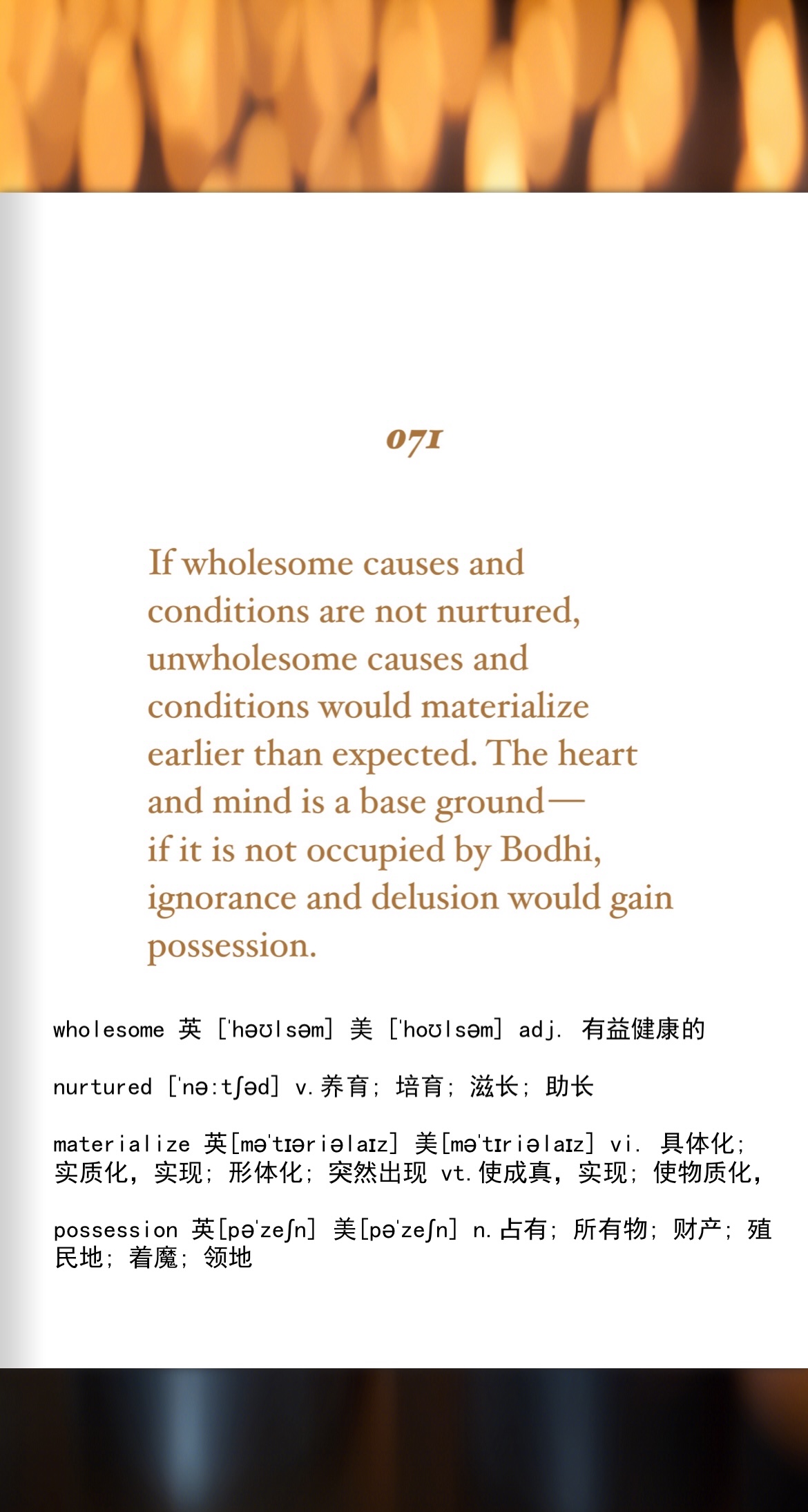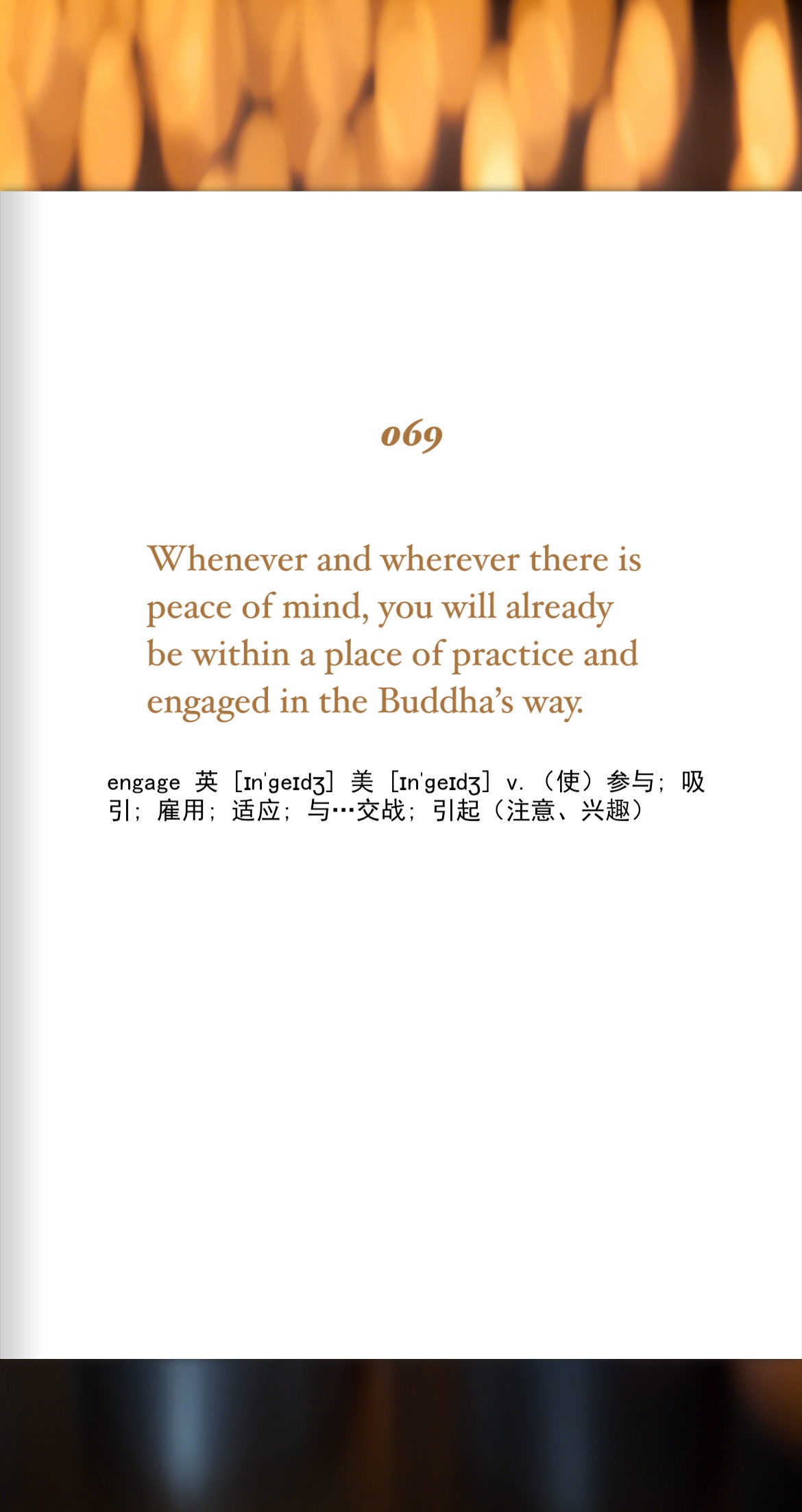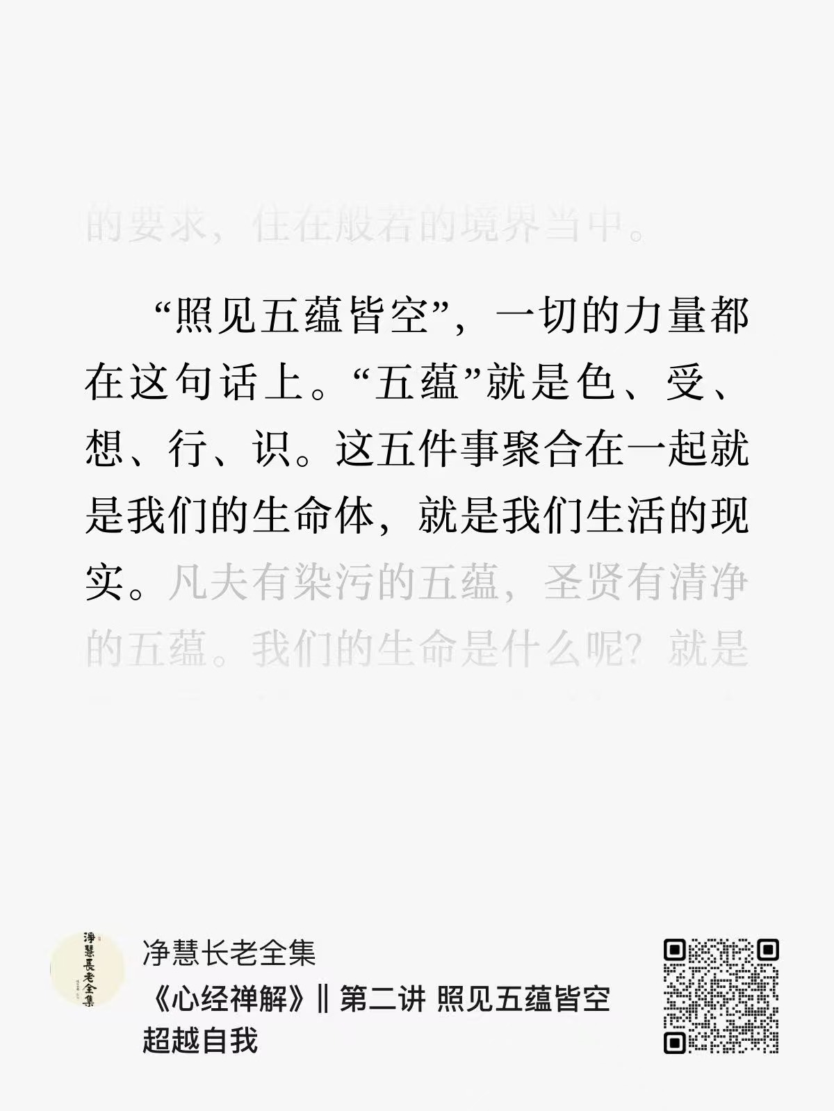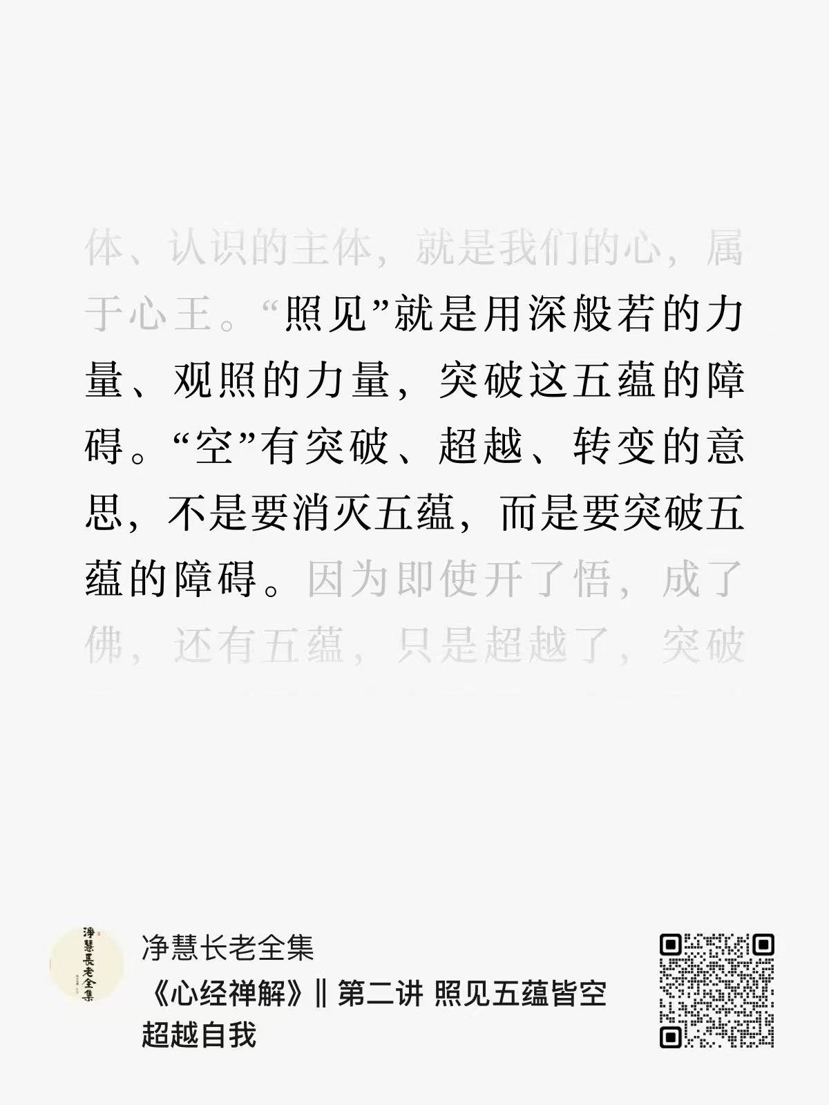 [【附件】什么是当下呢?——老和尚如是说(1).mp3](/media/attachment/2025/07/%E4%BB%80%E4%B9%88%E6%98%AF%E5%BD%93%E4%B8%8B%E5%91%A2%E8%80%81%E5%92%8C%E5%B0%9A%E5%A6%82%E6%98%AF%E8%AF%B41.mp3) [净慧长老开示:在当下一念上下功夫(视频)](https://mp.weixin.qq.com/s?__biz=MjM5MDM0MDY0NQ==&mid=2651274949&idx=1&sn=31502df82fe93135ebe197efbdefe2eb&chksm=bcc564a4e0235d6bd4411e11f5293624339ac59cd0fde6832c851a18ff39508c1f0399a013b5&mpshare=1&scene=1&srcid=0719lKXrn1x411puBFFm0UwT&sharer_shareinfo=efb41be4592c32f8b8ff2fcd06ca629c&sharer_shareinfo_first=efb41be4592c32f8b8ff2fcd06ca629c&exportkey=n_ChQIAhIQ2M9QRdirBfJtFfDhZXc5dBKeAgIE97dBBAEAAAAAAAIuBKFI9aMAAAAOpnltbLcz9gKNyK89dVj0%2BHbigWUUdKDHUdamP6gLahoY%2FXABvdsh%2BRMFNsQXuZ16A2k9SquMf3CKDAU5%2FNmZKojL8a41Ex2H0%2ByONA80a5aeyTvWGMuoKHH5WOs3cZvx%2FlbYL%2BsjMcESfcaIoIqLjsojCiUkCZ7UALvcGmb8Hvd5nNIkqqiXz4guL0Llt71iyY79KPa0DI6Yy1QLImLuFD0abD3PCJ%2FYqciQ6xKIbGGxj5OJbDjnUkkeIshLZxw%2Bm2QaBbsYUEvmUWBzqEoyhf98%2Br%2BFUqRmmpPXnIfz8ODv%2B0kBhAoCBvbAp%2Fqn2Ry2n5Oh5iA6wkchCzAJ%2BT%2BwHWvlk6wBiFc%3D&acctmode=0&pass_ticket=5VyNy5tjNBcYMu6sAlT%2BvYI6PAVOPqVSsi8AY6wh2hc4h86%2B3uJlBET%2B6EAU8X%2BK&wx_header=0#rd "净慧长老开示:在当下一念上下功夫(视频)") [《每日精进》科比:睡眠与冥想](https://m.baidu.com/video/page?pd=video_page&nid=7545303777375248577&sign=&word=%E3%80%8A%E6%AF%8F%E6%97%A5%E7%B2%BE%E8%BF%9B%E3%80%8B%E7%A7%91%E6%AF%94%EF%BC%9A%E7%9D%A1%E7%9C%A0%E4%B8%8E%E5%86%A5%E6%83%B3&oword=%E3%80%8A%E6%AF%8F%E6%97%A5%E7%B2%BE%E8%BF%9B%E3%80%8B%E7%A7%91%E6%AF%94%EF%BC%9A%E7%9D%A1%E7%9C%A0%E4%B8%8E%E5%86%A5%E6%83%B3&atn=index&ext=%7B%22jsy%22%3A1%7D&top=%7B%22sfhs%22%3A1%2C%22_hold%22%3A2%7D&_t=1753766971898 "《每日精进》科比:睡眠与冥想") [净慧禅语 || “执著”就是······](https://mp.weixin.qq.com/s?__biz=MzU2MzY2MjQ3OA==&mid=2247507758&idx=2&sn=7235c263a239b6c04c9a06ec4b142c35&chksm=fd4f2ab79698750161d0fad91c3e071436b1ac29d8b4026dc994e189f647a48ad98a06fe4c18&mpshare=1&scene=1&srcid=0719gDkVHUeMyIZ3D6gIuQk1&sharer_shareinfo=7b8866ce7ca1bf0d777581b1c242f117&sharer_shareinfo_first=7b8866ce7ca1bf0d777581b1c242f117&exportkey=n_ChQIAhIQcRqeyyRE7vLZMka44QP1AhKeAgIE97dBBAEAAAAAAPWtCUzTgvEAAAAOpnltbLcz9gKNyK89dVj0VT3Z863Y1Gvx6xOEfzrhePzQD3g3qT5ZzDKgAW8uTTc2hPUAhb9tH0wMm%2B4ILfCbHr3oi6zeVKZU3rRJqhwsHT6uCBqe7nDzAD6uGI0c6UPh1MVVOFK6ewAXdburcu24eHWm2oYcIn6uaBDV6S1AaTrquqJSwhjhW6vLKfXZRg1GYNZOBcK4yRHyVrK9mlguVJyMGpkUDrfbMXzyYFdfmjDGq92lhyF0MIPwQEnJ9skzoB1xVJ9voIodfLgSoQITX5vWeL3eL%2BC2kh8ANaP1Mvita7O1Y9AV52jsJIyZ%2Bg1FoefeRf%2Bw%2FTLejOJk9lN3fxYgnSKVzVY%3D&acctmode=0&pass_ticket=PfEX9riVW5%2BxTTXINvond6PbN3Nw9cD7W2HYTI0z04fVR957%2FunRHu7enUdVoMDM&wx_header=0#rd "净慧禅语 || “执著”就是······") [净慧禅语 || 突破执著](https://mp.weixin.qq.com/s?t=pages/video_detail_new&scene=1&vid=wxv_2813872923781677059&__biz=MzU2MzY2MjQ3OA==&mid=2247505124&idx=2&sn=cd6775e8685cbdba57ffa7f6151558c4&vidsn=&sharer_shareinfo_first=2a537f70cba319e294b49d5697670844&sharer_shareinfo=2a537f70cba319e294b49d5697670844&exportkey=n_ChQIAhIQLA2Kb3M4nyrxbwBPWuxlxhKeAgIE97dBBAEAAAAAAIp1DqzAykEAAAAOpnltbLcz9gKNyK89dVj0bCkIKbjf3%2Fd6bhVXq5HaoucbmYPkCEiF8xjCkDuizSh1ZCPsapfuQu8Zt5Y82ODlEGqOR%2BsaXTK%2BsJSvCHS6%2B5m%2BTnlZwH4Vh2FbMAIl6OB%2BDOY4UjjAQJTC6cOlwDdKIfGBLCu%2BlI5ssNRyB0mzIVNiLL2ces%2FGRzYqUKFYWH9%2BxBgrVoVbAasxz2bKxJGMEej8giB5IloQvc0JNEyaWjBbQ37aPjC1j7twVr7dyUrFoq7xfxnB8EOeWAjfkbeVXPGcObpwSoUrYYwWLXVleli7DeznItcxMV4vKGbpNfog%2BMcMfl5SlhUuYGMABLkO3pAqb%2BjmS%2Fc%3D&acctmode=0&pass_ticket=0oifX01nLUvN%2BUb1qir8G6SkMlt56ZftF6uqUtv2Pb4VKhTp3w712M5LxtMjNYEl&wx_header=0&poc_token=HNNciGijf_GkLT5Oxc4-7Ei1qmwhOooUM5x6-vdS "净慧禅语 || 突破执著") [【附件】《心经》与生活禅+②+第二周学习--+破执著+-+第二周汇总.pdf](/media/attachment/2025/07/%E5%BF%83%E7%BB%8F%E4%B8%8E%E7%94%9F%E6%B4%BB%E7%A6%85%E2%91%A1%E7%AC%AC%E4%BA%8C%E5%91%A8%E5%AD%A6%E4%B9%A0--%E7%A0%B4%E6%89%A7%E8%91%97-%E7%AC%AC%E4%BA%8C%E5%91%A8%E6%B1%87%E6%80%BB.pdf) [【附件】1601_raw 2025-7-27 104413 2.mp4](/media/attachment/2025/07/1601_raw_2025-7-27_104413_2.mp4) [【附件】1602_raw 2025-7-27 104413 1.mp4](/media/attachment/2025/07/1602_raw_2025-7-27_104413_1.mp4) [【附件】1606_raw 2025-7-27 104413 4.mp4](/media/attachment/2025/07/1606_raw_2025-7-27_104413_4.mp4) ------------ 【第二周所学】 @所有人 Morning everyone 睡眠始寤, 当愿众生, 一切智觉, 周顾十方。 Now as we are awake, we make a vow that all living beings attain perfect wisdom and great enlightenment all-pervasive throughout the ten directions. 当您看到这个信息的时候,请停下来,三称: 南 无 大 悲 观 世 音 菩 萨[合十] 南 无 大 悲 观 世 音 菩 萨[合十] 南 无 大 悲 观 世 音 菩 萨[合十] 【口念,耳听,心观。每个字,念得清清楚楚,听得明明白白】 Amitabha![合十][合十][合十] We are incredible!![庆祝][庆祝][庆祝] Unleash our potential and let's dive into the reading plan this week! 《心经》与生活禅 · 中英文读书 第二周读书计划: Reading plan this week: ①Heart Sutra and Living Chan || Demolition of attachments 破执著 ②Take note and try to apply it in your own words to share your thoughts and feelings with us together here. ③ Contemplate every action you take ~~~~~~~~~~ Practice focus Week 2: 1. 本周继续早晚各默念《心经》7遍,口念,耳听,心观。每个字,念得清清楚楚,听得明明白白。 2. 说话时“照见”[witnessed with luminous insight] —— 在自己说话时,照见自己说的每一句话,听清楚自己说的每一个字;听他人讲话时,听清楚每一句话,每一个字。 [庆祝] 🚨**本周所学文章:** [《心经》与生活禅 · 中英文读书 || Demolition of attachments 破执著](https://mp.weixin.qq.com/s?__biz=MzU2MzY2MjQ3OA==&mid=2247513751&idx=1&sn=9c9b46e9342070caf17a1a0a953cc728&chksm=fd7b68b43af3fbeb0a3ab56d103719efc93e265d3f1a9f0f8ce4c92a74e1e22e86caf1cda4de&mpshare=1&