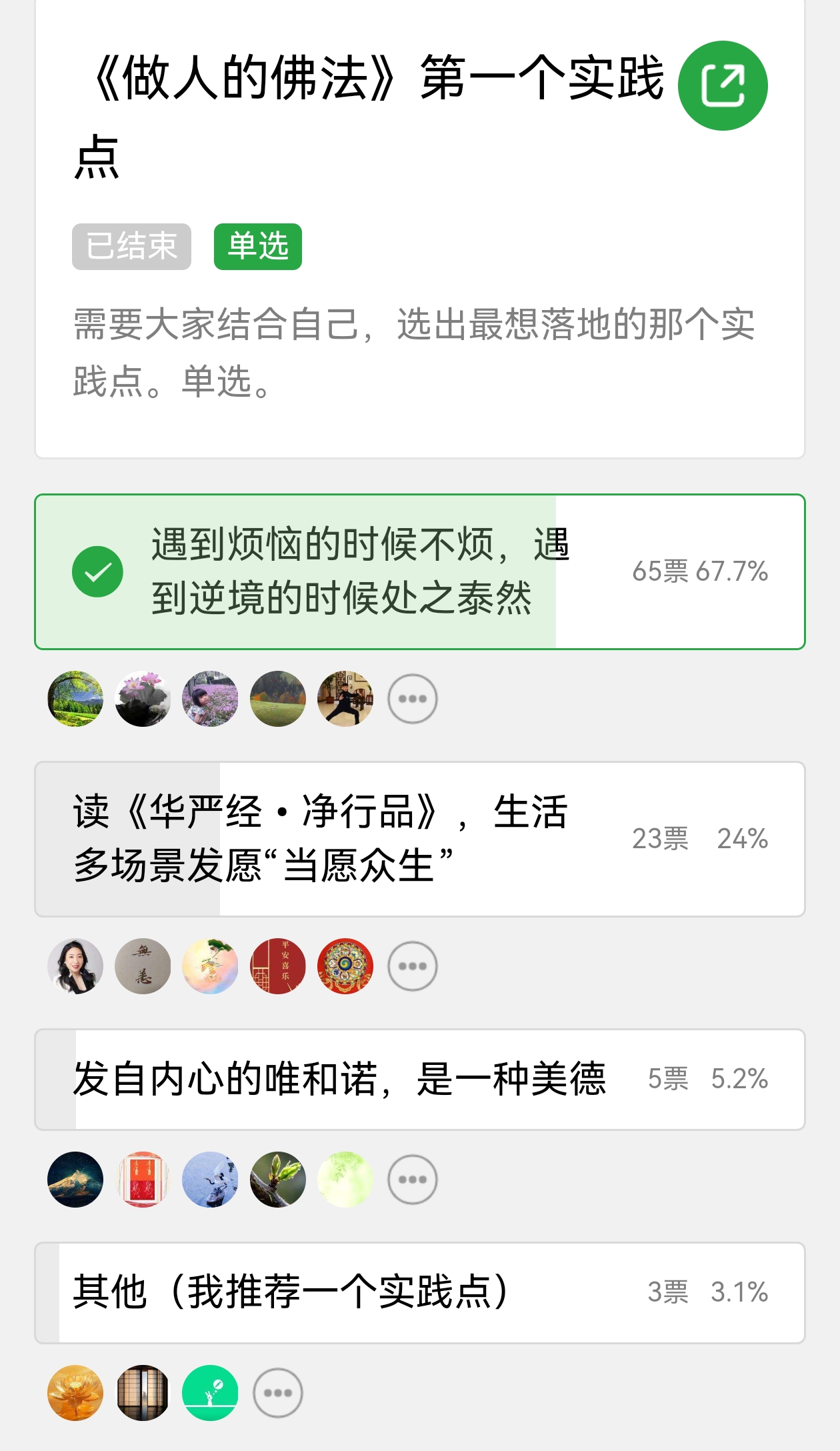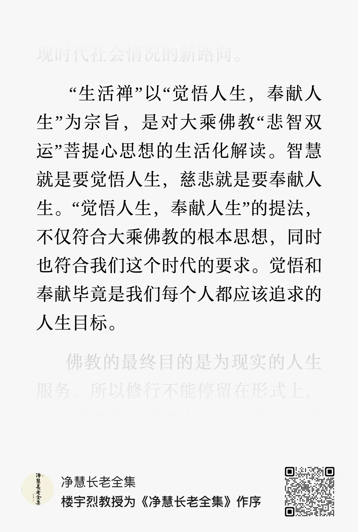 预热:2025年8月27日~31日 目录如下: 一、已学 二、关于《做人的佛法》电子书 三、关于《做人的佛法》纸质书 四、大家分享,更多见鹅打卡 五、待学(陆续延展) 六、实践投票,大家选出 七、群规,见群公告 ------------ ## 一、已学: ① [善生经•仁慧草堂](https://mp.weixin.qq.com/s/IHqtilgvM4xZKEm-mdzZ9w "善生经") ② [传印长老为《净慧长老全集》作序](https://mp.weixin.qq.com/s/1ogf-ieVaM8PyBmxUH0lbw "传印长老为《净慧长老全集》作序") ③ [楼宇烈教授为《净慧长老全集》作序](https://mp.weixin.qq.com/s/P6wfPsTP0hN-YRv3gVNLRg "楼宇烈教授为《净慧长老全集》作序") ④ [《生活禅者》纪录片•上](https://mp.weixin.qq.com/s/HzWcDymrIKHfbE-HaGkKLQ "《生活禅者》纪录片•上") ⑤ [《生活禅者》纪录片•下](https://mp.weixin.qq.com/s/AiLrWWspyv6IU646H03X8A "《生活禅者》纪录片•下") ⑥ [生活禅的性格](https://mp.weixin.qq.com/s/MWt4QuykPa3VeB6mlEbfMg "生活禅的性格") ⑦[《五叶堂序跋记集》||《做人的佛法》自序](https://mp.weixin.qq.com/s/dY-hKe08olZjV5R21V0gQA "《五叶堂序跋记集》||《做人的佛法》自序") ⑧[文中(修生活禅以做人为根本的四句法门)](https://mp.weixin.qq.com/s/_McUP_Xk1HM0WVizyjCqcw "文中(修生活禅以做人为根本的四句法门)") ——————————————————— @所有人 ## 二、关于《做人的佛法》电子书 https://quanji.hmszs.org 净慧长老全集 网页版的电子文库,更新如上,可加书签🔖,可在单本书内搜索🔍 之前的简版如下: http://qj.hmszs.org/index 可复制,可引用 供道友们,随需而用[礼物] ## 三、关于《做人的佛法》纸质书 了解几个寺庙,暂请不到书,若有书的信息会第一时间群里汇报。 大家可在孔夫子旧书网(大概17元),淘宝网(文博书舍)等(20多~30多不等价格)找一下。 补充:了解的情况,目前柏林禅寺流通处暂时没开。 ✓:大家各显神通吧,群里莫再交流纸质书。[合十][合十][合十] ## 四、大家分享,更多见鹅打卡 戴琼:《生活禅者》🪷 一个信仰一个智慧 最终要落时到灵魂深处以后,即使社会多么动荡,都不会被毁坏,心不住相 不被外物所牵制,心不被外面的世界所缠缚,其实就是禅的智慧。禅的智慧就是 面对仼何境界轻轻的一转,把它转成你生命的肥料,转成你不要跟它对抗,转成安住当下接受当下,那这样就是一种超然,就永远不会被打败🙏    ## 五、待学(陆续延展): ✓ 当代佛教契理契机的思考 ✓ 生活禅开题 ✓ 信解行证——修行的次第 ✓ 关于“生活禅”理念提出二十周年的一点感想 ✓ 师父对我是全部的影响(明基法师) ------------ ## 六、实践投票,大家选出 @所有人 诸位陆续入群的道友们,明天《做人的佛法》正式启卷。 邀请大家学用并行中,以实践来落实并激活所学🌈 但这个实践点是不是您想操作的那一个,得空请投票,根据大家的声音,我们确定实践点[握手] 第一个实践点:1~2周 选项一:「遇到烦恼的时候不烦,遇到逆境的时候处之泰然」 取自:http://qj.hmszs.org/viewbook?contentid=b488b56e-b443-4c7b-ac90-1a72735e5b81&type=2 实践点:今天我有没有起烦? 为啥烦,怎么转烦?烦去泰然现[太阳] [咖啡] 实践延展 【人生三很:我很忙,但我心里很闲;我很累,但我心里很充实;我有很多烦,但我也有很多机会,我很感恩。---明海大和尚】[合十] 《“人生三很”及出路》 http://chan.bailinsi.net/2016/2/2016203.htm 这篇很贴切生活,很忙、很累、很烦怎么转化,学用起来🌼🍃 ——————————— 【选项二】实践出处 第一讲:作为修菩萨行的人,每做一件事都要发愿;一天从早上到晚上,生活的方方面面、点点滴滴,自己如何,也当愿众生如何如何,《华严经•净行品》就是佛经中生活禅的一部最典型、最重要的经典读本。 【实践点】读《华严经•净行品》,练习在不同生活场景模式下造句发愿“当愿众生”。 ———————————— 【选项三】实践出处 第一讲:发自内心的唯和诺,是一种美德。 【实践点】梳理对照“虚伪的唯唯诺诺言行不一”。不断以日常琐事照镜子,增强践诺的力量。 ———————————— 【选项四】我推荐一条实践点,格式如上,内容如下…… 投票结果如下。↓  ------------ ## 七、【群规】,见群公告 欢迎诸位师友们入群,9月1日启卷,群空间共守群规[合十]: ①【群昵称】微信昵称+城市; ②【善护念】维护正清和雅的学风,不转发无关链接,聚焦到本群所学及延展内容上。不论时政及热点,无商业无红包,不加私信; ③【群互动】群屏幕,大众空间,须言之有物,简洁完整;避免刷屏,不单发表情等;观照自心,切切护念。 ④【学用并行】每日6:30轮值小书童发布学用内容,广学深思实修,学用相资,螺旋成长。 ⑤【线上共习】每周末一次共习,平日有午间或晚间茶摊/叩原典门(腾讯会议); ⑥【温馨提示】若有违规,抱请出群,申请通过后回归。 未来21周,让我们在做人与做事的实践中,开挂幸福人生[福]